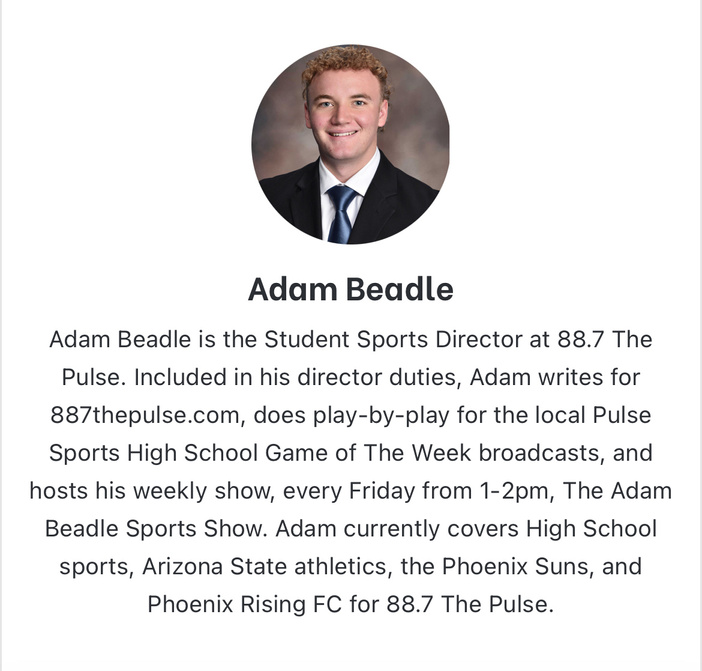 My name is Adam Beadle, I am an 18 year old college student who is aspiring for a career in sports journalism. I most recently served as the Sports Director at KVIT-FM 88.7 The Pulse.